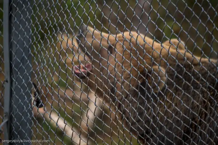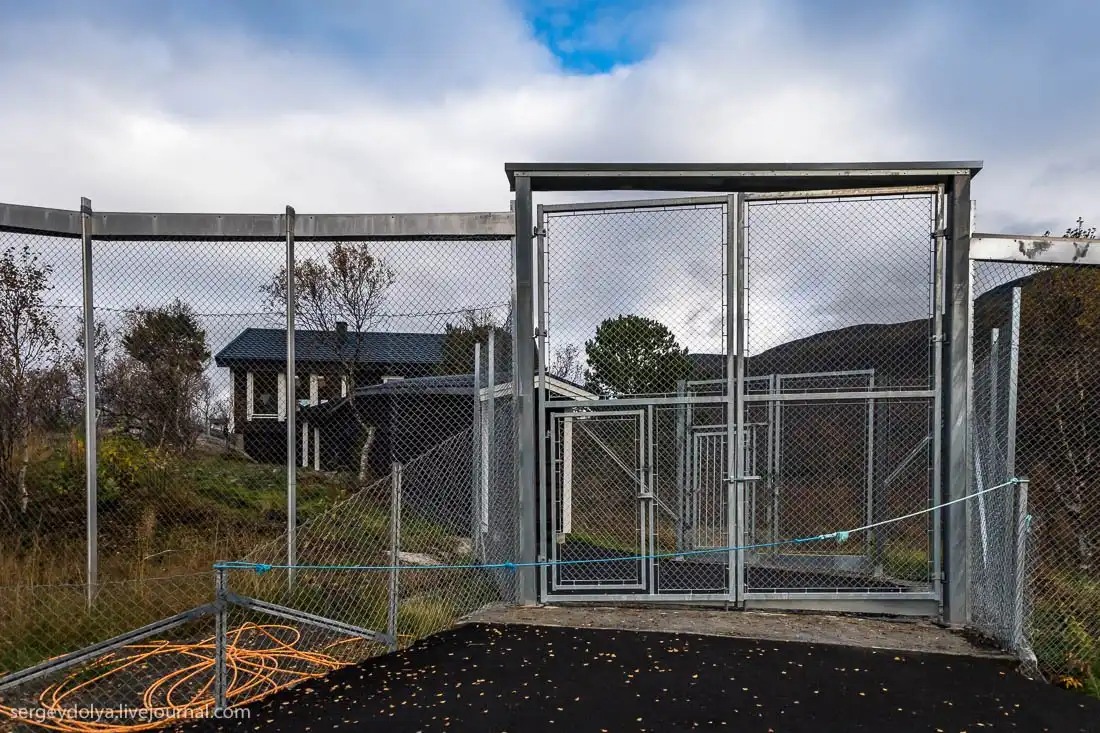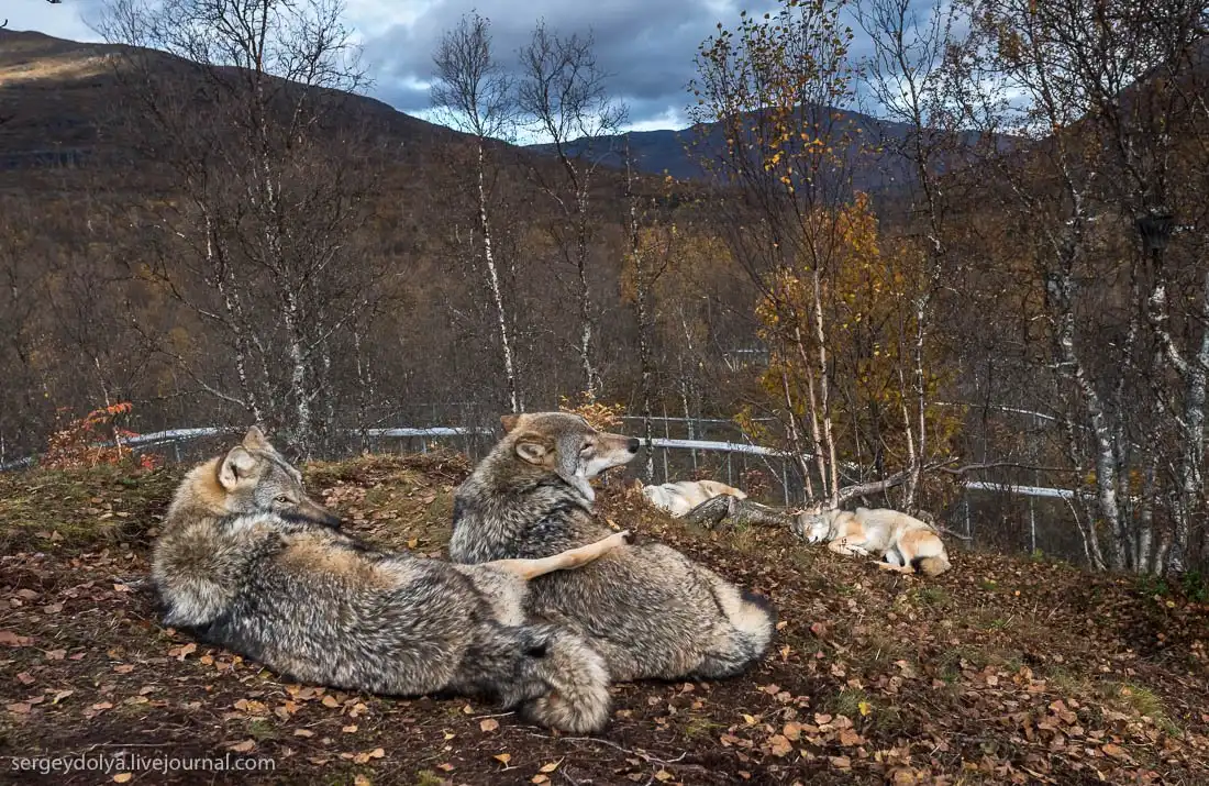 Вольер волчьей стаи напоминает фильм "Парк Юрского периода" - такая же высоченная ограда в два ряда. Размер тоже немаленький, как пять футбольных полей. Честно говоря, поначалу заходить довольно боязно, особенно, если заметить, что волки уже поджидают гостей: