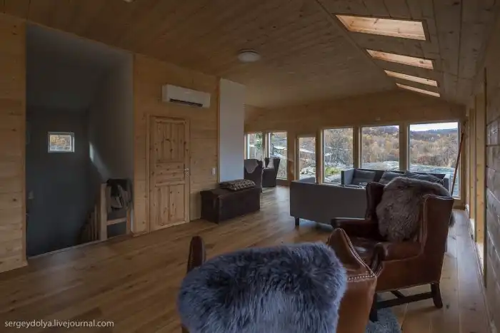 Внизу пять спален, вверху большая общая зона с панорамными окнами:
