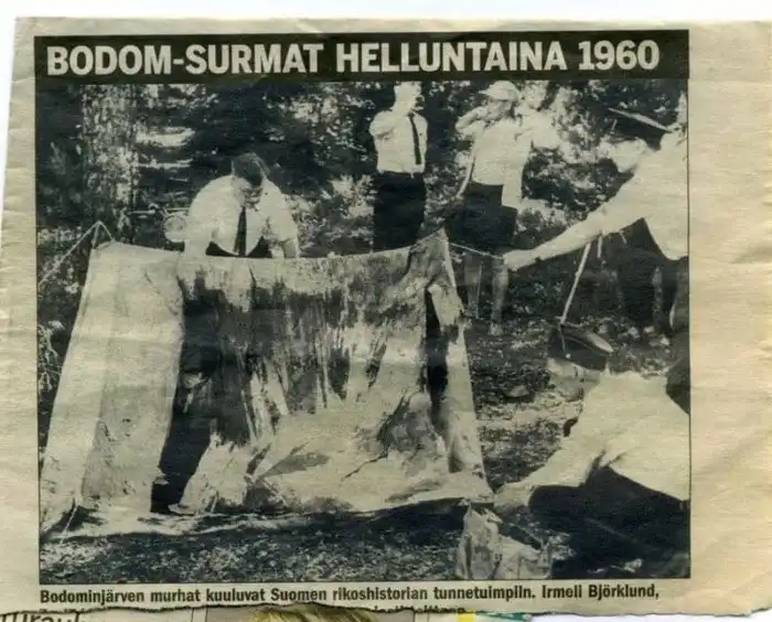 Летом 1960 года четверо финских подростков - Виллем Густаффсон, 18-летниий Сеппо Антеро Бойсман, 15-летняя Майра Ирмели Бйорклунд и 15-летняя Анья Туллики Макки - отправились с палатками на озеро Бодом возле города Эспроо. Рано утром 5 июня 1960-го неизвестный убийца с ножом напал на их лагерь, и прежде, чем они успели проснуться, зарезал всех, кроме Густаффсона, которому чудом удалось сбежать. Расследуя это громкое преступления, финская полиция вышла на троих подозреваемых. Первым был арестован Пентти Сойнинен, местный житель, страдавший психическим расстройством. Он даже сознался в убийстве - но в его признании полиция нашла массу явных натяжек, уверившись, что убийца - не он. Тем не менее, 9 лет спустя Сойнинен покончил с собой в годовщину убийства. Вторым подозреваемым стал местный алкоголик Вальдемар Гиллстром, ненавидевший туристов, а третьим - еще один местный житель, Ханс Ассман, по слухам, связанный с КГБ. В ночь убийства на Ассмане видели одежду со следами крови - однако полиция не сумела найти вещественных доказательств. Кто из троих был убийцей? Или это был некто четвертый? Ответ так и не удалось найти.