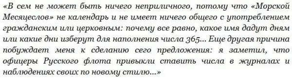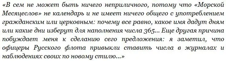 Почти все живущие ныне считают, что «новый стиль» в русском календаре был введен в феврале 1918 года. С точки зрения декретирования это так, а практически его ввели в употребление моряки русского военно-морского флота еще более ста пятидесяти лет назад, в 1824 году. Вызвано это было потребностью издания «Морского Месяцеслова» — собрания астрономических таблиц на 365 дней вперед, необходимых для определения местонахождения корабля в открытом море.