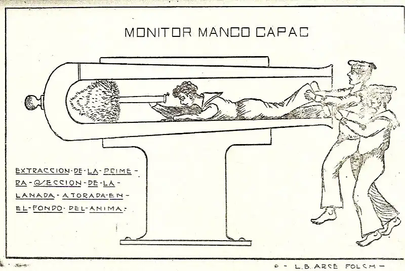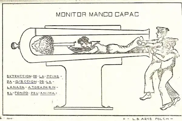 На картинке - методика чистки ствола дульнозарядного орудия Дальгрена на перуанском броненосце XIX века "Манко Капак".