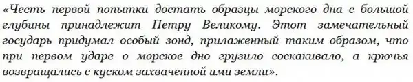 Идея лота — прибора, позволяющего измерять большие глубины и одновременно брать пробы грунта, — принадлежит Петру I. Приоритет русского царя в изобретении глубоководного лота признан как русскими, так и зарубежными учеными. Вот что писал в середине XIX века по этому поводу американский метеоролог и океанограф М. Мори в своей книге «Физическая география моря»: