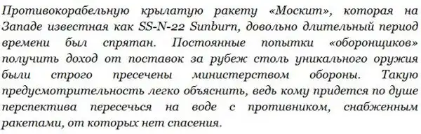 Военные не скрывали, что согласились на снятие с «Москита» грифа «совершенно секретно» после многочисленных атак со стороны властей Приморского края. В Минобороны были готовы выдержать любой прессинг, но на рассекречивание не идти, если бы не аргументы «оборонщиков», убедивших адмиралов, что имеют в заделе ракеты нового поколения, способные компенсировать потерю приоритета в «Москитах».