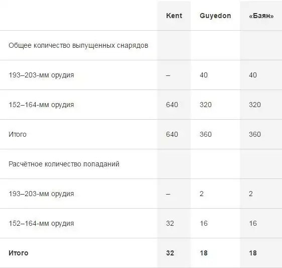 Точное количество британских выстрелов неизвестно (ориентировочно около 270 с дистанции 4500 метров, около 400 – с дистанции 2100 метров и около 270 – с дистанции не более 500 метров), в отличие от количества попаданий (около шестидесяти). Очевидно, что удельный вес точных попаданий на уровне 6% при благоприятных условиях стрельбы – это недопустимо низкий результат (считается, что Nurnberg добился 27 попаданий в Monmouth, выпустив не более 50 снарядов).