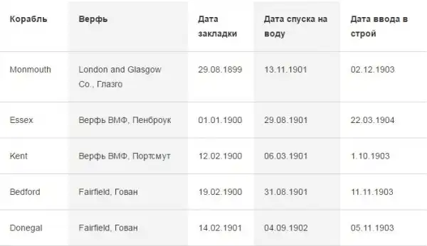 Крейсеры Kent и Essex были заказаны в рамках поправок к кораблестроительной программе 1898/99 годов, Monmouth и Bedford – к программе 1899/1900 годов, прочие – годом позже. Существует версия, что со строительством крейсеров Kent и Essex медлили умышленно, настаивая на внесении изменений в проект, но более вероятным кажется то, что изменения в программу были внесены уже в 1899 году. Крейсеры типа Kent подвергались критике уже на стадии строительства, и многие британские военно-морские специалисты указывали на то, что они «не соответствуют эффективному выполнению задач, для которых эти корабли проектировались».