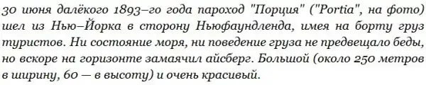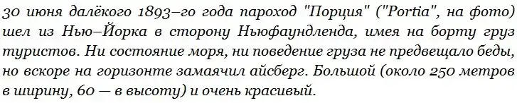 День был солнечный, океан — спокойный, видимость — прекрасной, и капитан вполне владел ситуацией, пока не начались проблемы с грузом: обалдевшие от восторга туристы потребовали зрелищ на минимальной дистанции. Кто–то хотел просто полюбоваться переливающимися глыбами льда, кто–то уже лихорадочно делал наброски в блокноте или на зависть окружающим расчехлял новенький "Kodak"... Ситуация выглядела совершенно безопасной, и "Порция" взяла курс на сближение. Вскоре айсберг буквально нависал над кораблём.