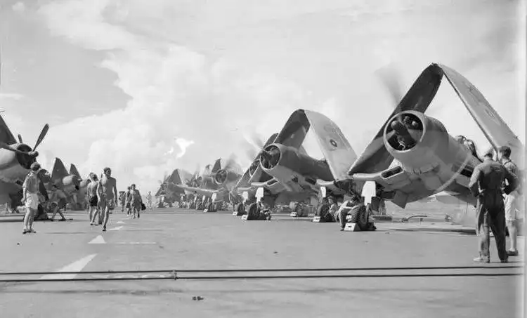 Ситуация стала меняться во второй половине 1943 года. Капитуляция Италии позволила высвободить часть сил Королевского ВМФ, в том числе авианесущие корабли. Накапливался боевой опыт, что позволило пересмотреть консервативные взгляды англичан на роль палубной авиации. Важным событием для британских моряков стала служба тяжёлого авианосца Victorious на Тихом океане летом 1943 года. Корабль временно передали в состав ВМФ США для восполнения потерь, понесённых у Гуадалканала, и он действовал совместно с тяжёлым авианосцем Saratoga. Victorious модернизировали на американской верфи, его авиагруппу подготовили по стандартам американской морской авиации. Британским морякам и лётчикам не довелось принять активного участия в боях с японцами, но они многому научились у более опытных союзников.