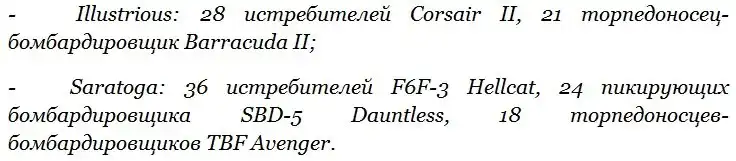 Ударной силой союзников было оперативное соединение 70 под командованием вице-адмирала сэра Артура Пауэра: тяжёлые авианосцы Illustrious и Saratoga, линейный крейсер Renown (флагман), один тяжёлый и один лёгкий крейсер, шесть эсминцев. Кроме того, британская подлодка Tactician обеспечивала разведку и спасение сбитых лётчиков. В распоряжении контр-адмирала Клемента Муди, командовавшего авианосцами, имелись следующие воздушные силы: