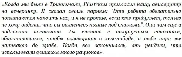 Несмотря на подобные подшучивания, моряки и лётчики двух флотов радостно приветствовали друг друга. 2 апреля американо-британское авианосное соединение прибыло в базу Тринкомали на острове Цейлон, и знакомство продолжилось на суше. Командир истребительной эскадрильи авианосца Saratoga коммандер Джозеф Клифтон вспоминал совместное времяпрепровождение с английскими авиаторами: