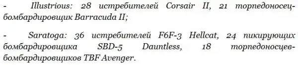 В 1943 году активно шло перевооружение британской морской авиации (FAA — Fleet Air Arm) новыми моделями самолётов, что позволило существенно усилить боевую ценность авианосцев Королевского ВМФ. Проблему палубных истребителей удалось решить поставками американских F4U Corsair (сами американцы пока предпочитали использовать их с береговых баз). Англичане по достоинству оценили американский торпедоносец-бомбардировщик TBF Avenger (которым, в частности, вооружили авиагруппу Victorious на Тихом океане). Однако роль основного палубного бомбардировщика и торпедоносца, несмотря на относительно скромные технические характеристики, играла британская Barracuda. Пикирующие бомбардировщики в британском флоте так и не прижились.
