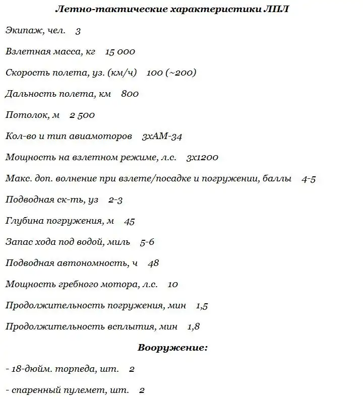 10 января 1938 года во 2-м отделе НИВКа состоялось рассмотрение эскизов и основных тактико-технических элементов ЛПЛ, подготовленных автором, Что же представлял собой проект? Летающая подводная лодка предназначалась для уничтожения кораблей противника в открытом море и в акватории морских баз, защищенных минными полями и бонами. Малая подводная скорость и ограниченный запас хода под водой ЛПЛ не являлись препятствием, так как при отсутствии целей в заданном квадрате (районе действия) лодка могла сама находить противника. Определив с воздуха его курс, она садилась за горизонтом, что исключало возможность ее преждевременного обнаружения, и погружалась на линии пути корабля. До появления цели в точке залпа ЛПЛ оставалась на глубине в стабилизированном положении, не расходуя энергию лишними ходами.
