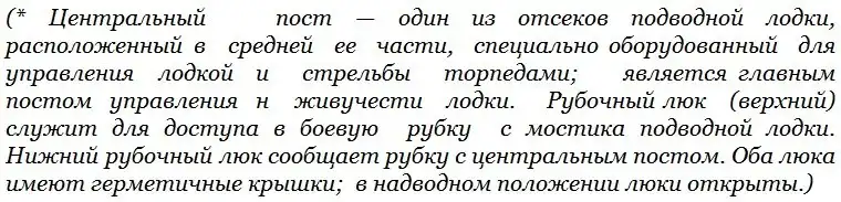 Снеговые заряды тяжелой липкой пеленой обволакивали лодку. Верхняя палуба и рубка покрылись толстым слоем льда. Даже внутри подводной лодки мудрено было в такой шторм остаться сухим. Окатив тех, кто нес верхнюю вахту на мостике, ледяная вода тоннами низвергалась через рубочный люк в центральиый пост*.