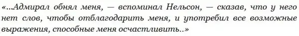 Черный от копоти, в изорванном мундире, Нельсон прибыл на борт флагманского корабля HMS Victory, где на шканцах его приветствовал адмирал Джервис.