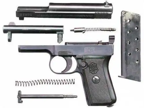 Карманный "Маузер" модели 1910 года был для своего времени отличным оружием. Он имел автоматику на основе отдачи свободного кожуха-затвора. Возвратная пружина располагалась под стволом. Ствол крепился в рамке за проушины в двух нижних приливах особым продольным стержнем. Последний удерживался в рамке трением и байонетной защёлкой. Ударный механизм ударного типа имел указатель взведения. Съёмная пластина на левой стороне рамки прикрывала спусковой механизм н запиралась поворотным рычажком. Смонтированный под щёчками рукоятки неавтоматический флажковый предохранитель запирал спусковую тягу и кожух затвора. Автоматический магазинный предохранитель при вынутом магазине запирал спусковую тягу и поднимал затворную задержку. После вставления магазина затворная задержка опускалась, и с помощью кожуха-затвора патрон досылался в патронник. Таким образом магазинный предохранитель делал разборку и сборку пистолета безопаснее, а перезаряжение несколько быстрее.
