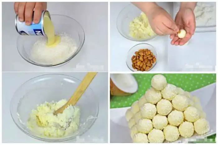 Та же сгущенка с кокосовой стружкой, только внтурь вложите миндаль, а потом еще раз обваляйте в сухой стружке