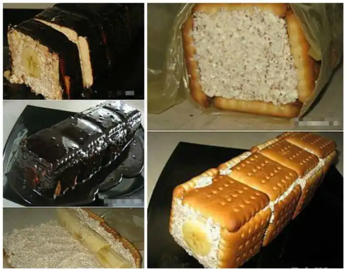 Пряники, сметана, сливочное масло, шоколад, сахарная пудра, кокосовая стружка. Прянички выложить и залить всем остальным в перемешанном виде.