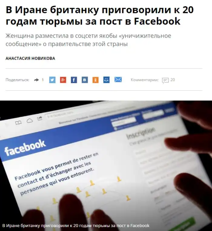 В Иране 47-летнюю британку посадили на 20 лет в тюрьму за пост в Facebook. Женщину по имени Роя Собери Неджат Нобахт обвинили в «намерении совершить преступление против национальной безопасности», а также в «оскорблении исламских святынь».