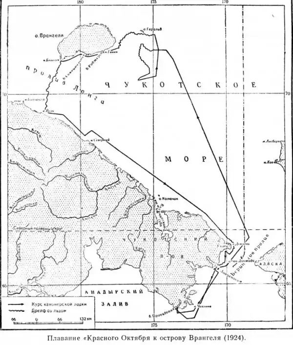 Красный Октябрь” вышел из Владивостока 20 июля 1924 г., 10 августа прошел Берингов пролив и, после упорной борьбы со льдами Чукотского моря, 19 августа достиг восточного мыса острова Врангеля.