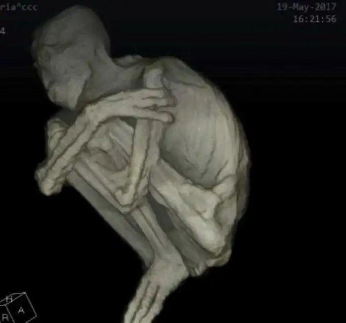 Мумия представляет собой странное трехпалое существо с длинным черепом, огромными глазами и тщедушным телом. Кто-то считает, что это подделка, мастерски выполненная из гипса, однако есть и те, кто утверждает, что найденная мумия - это останки пришельца.