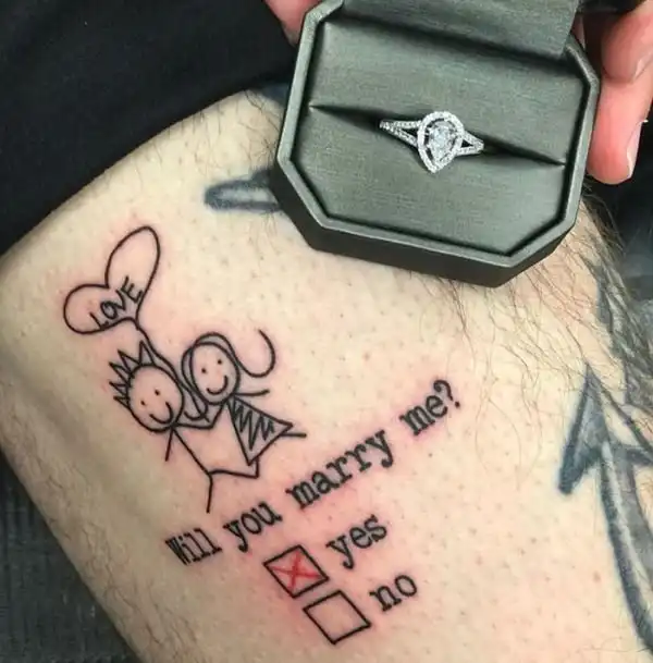 Тату-мастер Винни Капальдо-Смит из Колорадо сделал весьма необычное предложение руки и сердца своей девушке Брук Уодарк. Парень попросил ее набить ему татуировку, однако, татуировка с предложением выйти за него замуж уже была на его ноге, и девушке оставалось только лишь сделать свой выбор, поставив крестик в соответствующее поле. Куда она поставила крестик, смотрим далее.