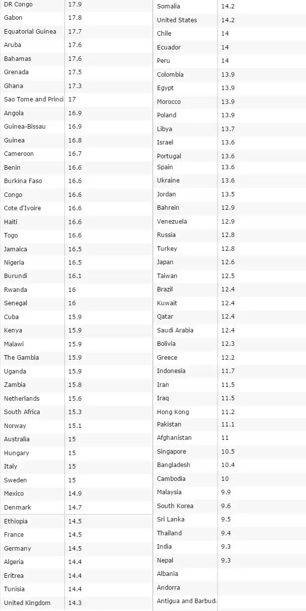 Самые большие члены на планете ДР Конго (17,9 см), Габон (17,8 см), Экваториальная Гвинея (17,7 см), Аруба (17,6 см), Багамские Острова (17,6 см), Гренада (17,5 см), Сан-Томе и Принсипи (17 см), Ангола (17,6 см), Ангола (17,6 см), Гвинея (16,9 см).