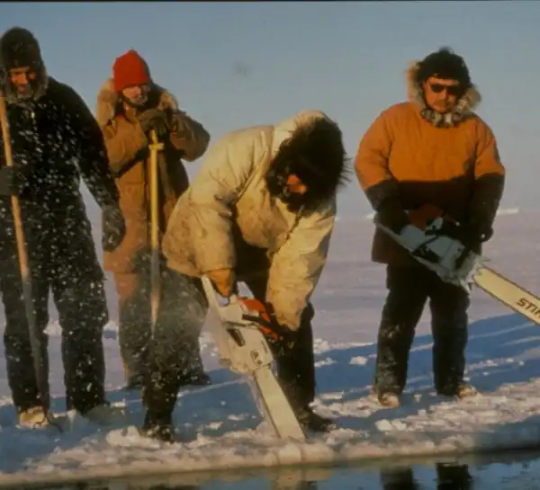 Охотник попытался при помощи цепной пилы прорезать путь во льду, ведущий к открытой воде. Соседи по деревне помогали охотнику, с помощью насосов не давая льду образоваться заново за ночь.