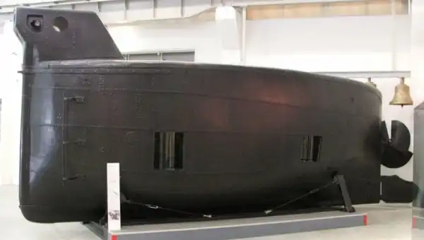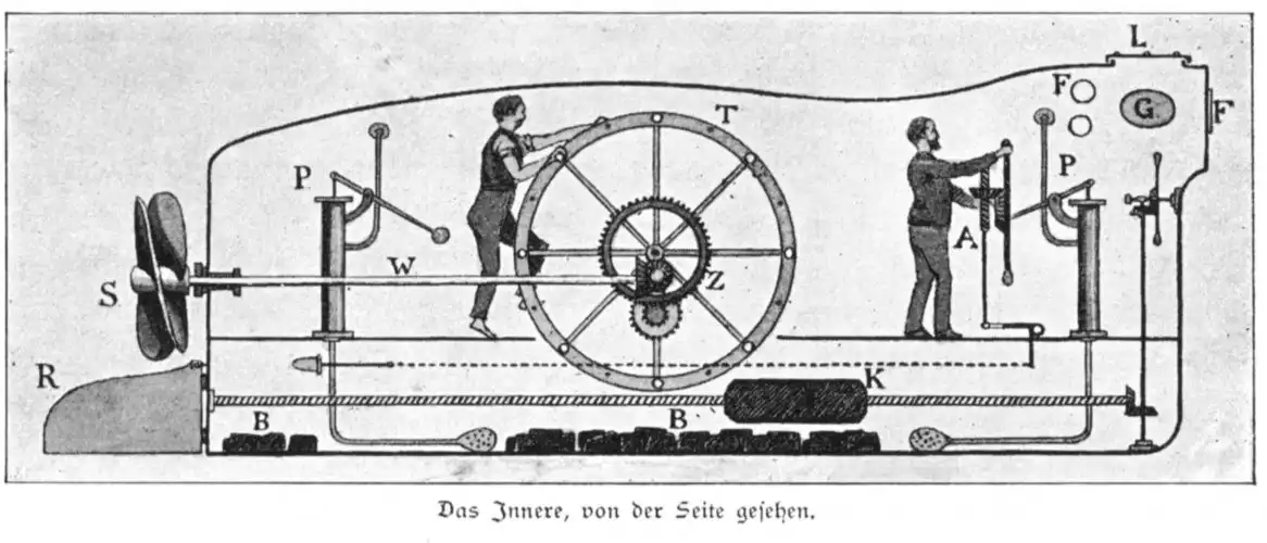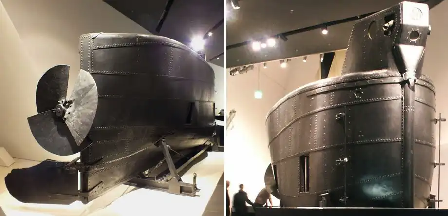 Интересно, что на лодке не было балластных цистерн, а вода заливалась прямо в корпус, под деревянную палубу. Сзади виден бак-баллон для сжатого воздуха.