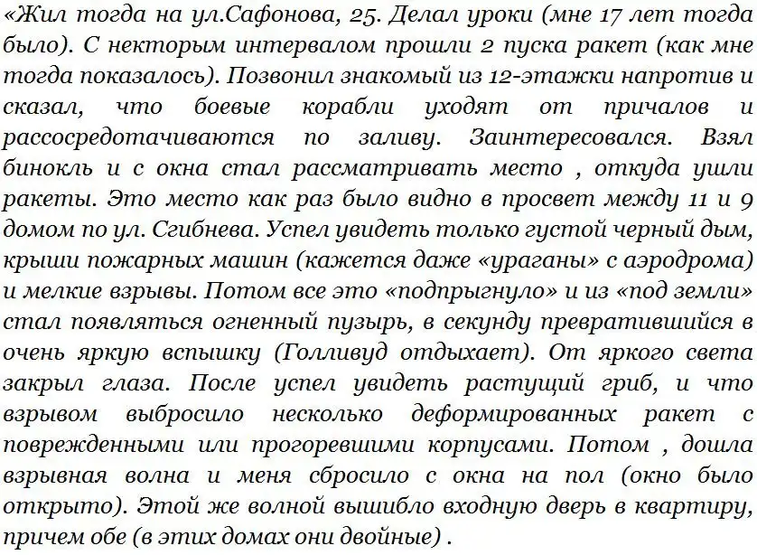 В 18. 15 был замечен дым на технической территории в.ч. 63976. Старший офицер соседней части позвонил оперативному дежурному в.ч. 63976 капитану третьего ранга Виктору Садовлахову, тот ответил, что знает о пожаре и принимает меры, через 25 минут, при первом большом взрыве , погибнет он, караульный матрос Рамиз Джабраилов, и несколько караульных тушащих пожар..