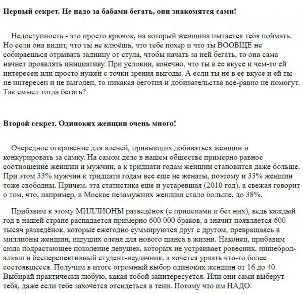 До 20ти лет - я считал что с женщинами мне светит разве что поцелуй, проигранный в игре на желание, или в "бутылочку". Готовил узелок - чтобы "В монастырь уйти" - не в прямом, конечно смысле, но имея ввиду - готовился прожить жизнь без женщин, и люто негодовал - что они такие нехорошие - нормальных парней не любят, а только мудаков каких то. И товарищ у меня был, которому в этом вопросе светило как и мне, или даже похуже, и мы по этому вопросу вместе негодовали, но вот он в армию ушёл, и покуда был он в армии - я умудрился с девушкой в онлайн игре познакомиться, то есть самым "задротским" методом, и "стать мужиком", что не прибавило мне шансов в общении с девушками - на мой взгляд, но хотя бы не девственником помру. Вернувшись с армии товарищ дельную мысль сказал - что мол "Не хочу так жить, хочу жить - чтобы и с девками знакомиться, и секс был, и в общем - не скучать чтобы одинокими вечерами".