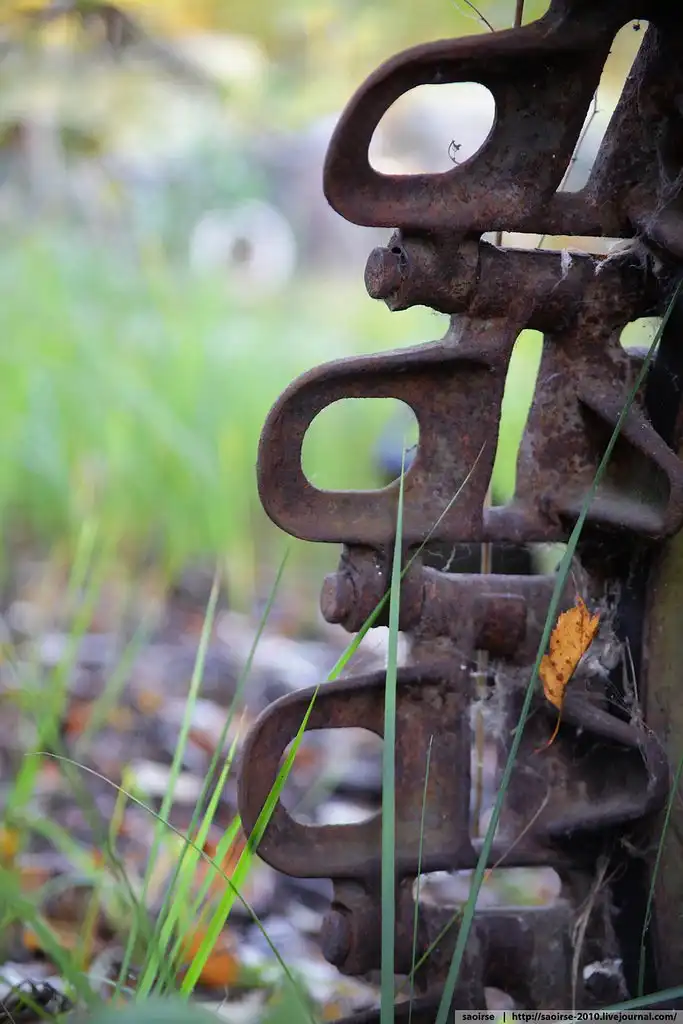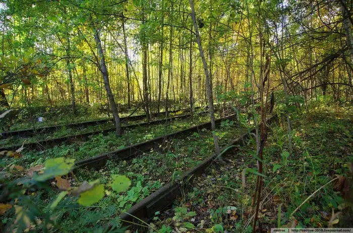 Пофотографировав с краю и убедившись, что людей нет, решено было пройти вглубь. Идти через лес было сложно, везде валялся металлический хлам и детали. А потом в лесу нашлись и очень старые железнодорожные пути.