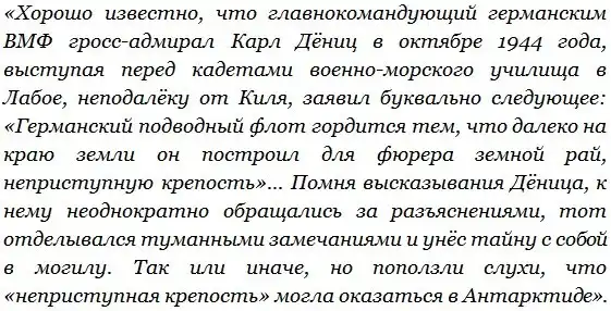Любой, кто хоть что-то читал о «конвое фюрера», обязательно встречал цитирование слов гросс-адмирала Карла Дёница, которые приводятся, как доказательство существования «конвоя фюрера» и базы в Антарктиде. К примеру, вот как пишет об этом в своей книге «Стальные гробы рейха» Михаил Курушин: