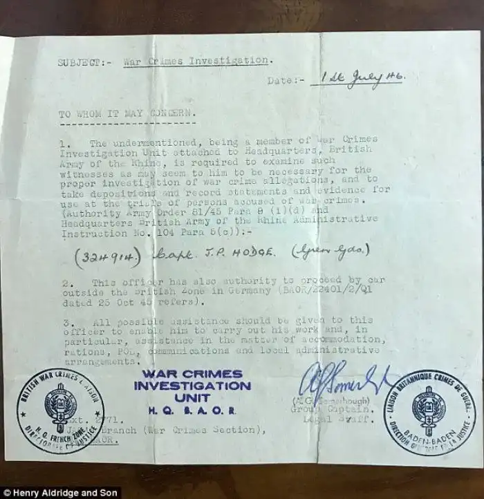 Капитан гвардии британских гренадеров Джон Ходж (на снимке) нашел адресную книгу в ящике стола в канцелярии Рейха. Справа - приказ Ходжа на арест высокопоставленного офицера СС