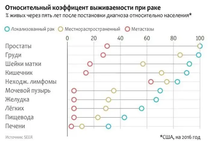 То есть, в развитых США те, кто заболел локализованным раком простаты или груди, почти точно не умрут от него за пять последующих лет. При раке печени или пищевода шансов выжить наоборот мало.