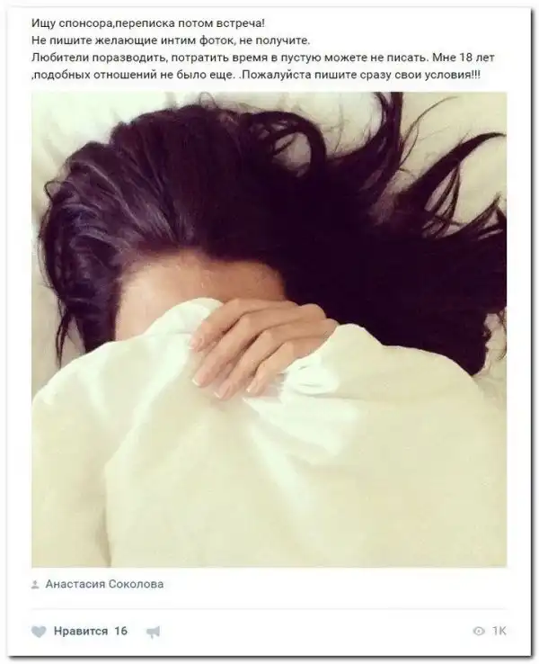 Эти наивные девушки хотят красиво жить и ничего не делать. Они надеются, что богатые спонсоры увидят их красоту, и в очередь выстроятся, предлагая свою помощь. Некоторые даже пишут, что никого интима, им должны заплатить чисто за приятное общение.