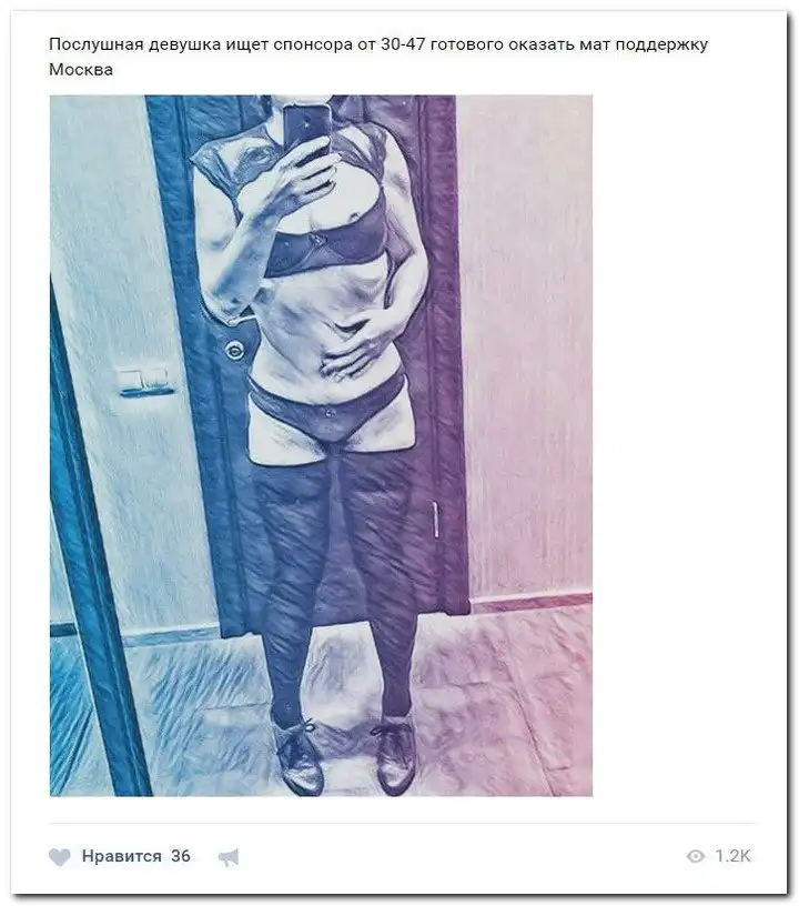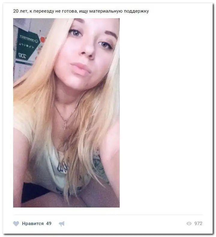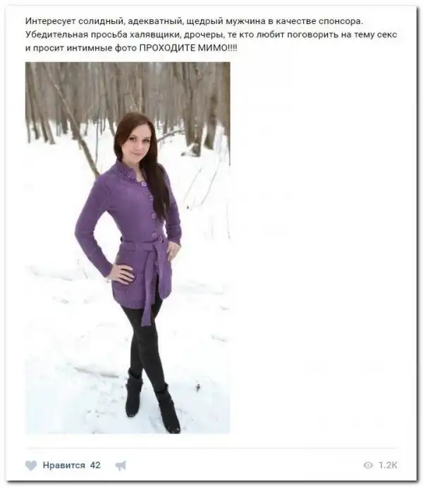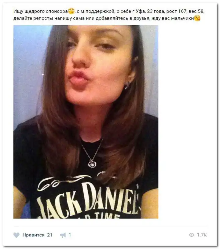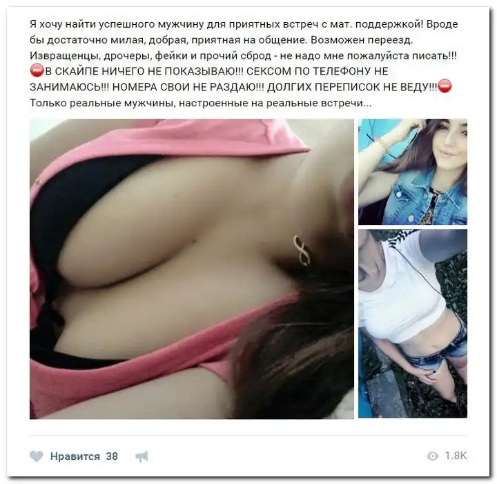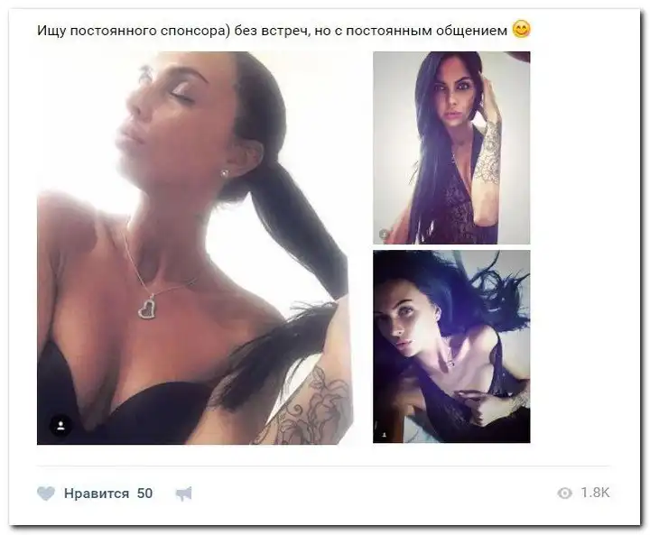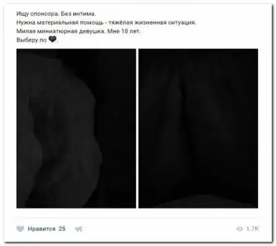 "Ищу спонсора без встреч" - это пздц. Я может чего не понимаю, но в чем интерес "спонсора"? за что он должен ее содержать? вот что у нее в голове вообще...