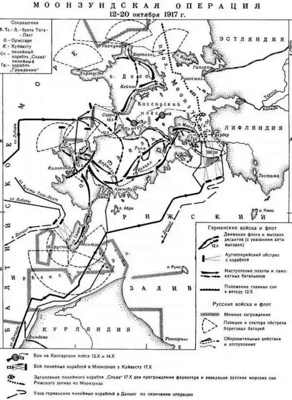 После захвата полуострова Сворбе путь в Рижский залива был открыт. Единственным препятствием для немцев оставались минные поля. Тральщики к 16 октября очистили пролив от мин. Утром этого дня отряд германских кораблей — линкоры «Кёниг» и «Кронпринц», легкие крейсера «Кольберг», «Страсбург» и «Аугсбург», эсминцы 8-й флотилии и 20-й полуфлотилии, а также тральщики и транспорты, — вошли в Рижский залив. Отряд шёл в Аренсбург, который должен был стать основным портом экспедиционных сил. Германцы опасались мин, поэтому двигались медленно.