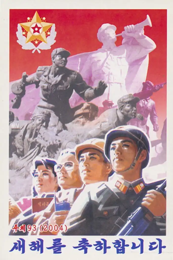 На заднем фоне изображены корейские военные разных времен: от боровшихся с японцами партизан до героев Корейской войны. На переднем плане — представители северокорейского общества (слева направо фермер, интеллигент, рабочий, солдат). Подпись на открытке: «С новым годом!»