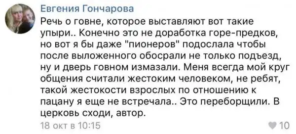 В Тихвинской панельке кто-то повадился регулярно гадить в подъезде. Установленная камера зафиксировала застранца - им оказался мальчик-подросток. Когда эту информацию вывесили в местной группе Вконтакте - у тамошних яжматерей полыхнуло ярче фейерверка. Тема фекалий легла на благодатную почву.