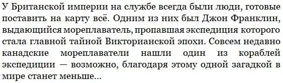 Британская империя на протяжении нескольких веков была владычицей морей и океанов. И поиски кратчайших путей, в том числе Северо-Западного прохода — морского пути через Северный Ледовитый океан вдоль северного берега Северной Америки и Канадского Арктического архипелага, — были приоритетной задачей Королевского флота Британии. В середине 19-го века на его поиски отправился известный английский мореплаватель Джон Франклин.