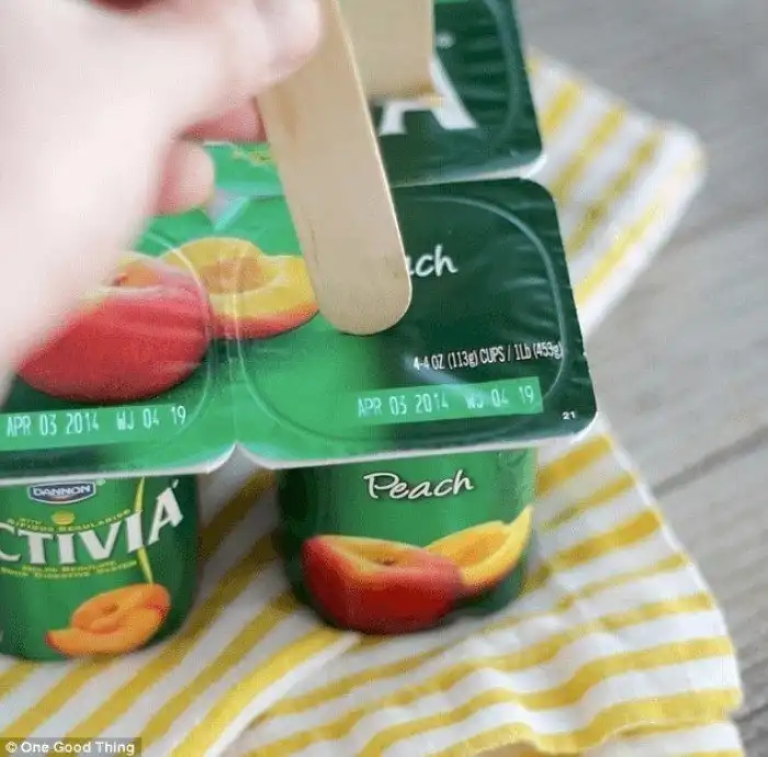 Захотелось вкусного мороженого? Проткните упаковки фруктового йогурта палочками для мороженого и положите в морозилку. А потом наслаждайтесь!
