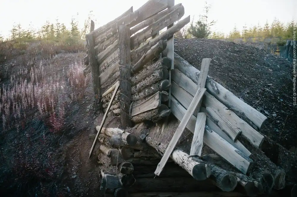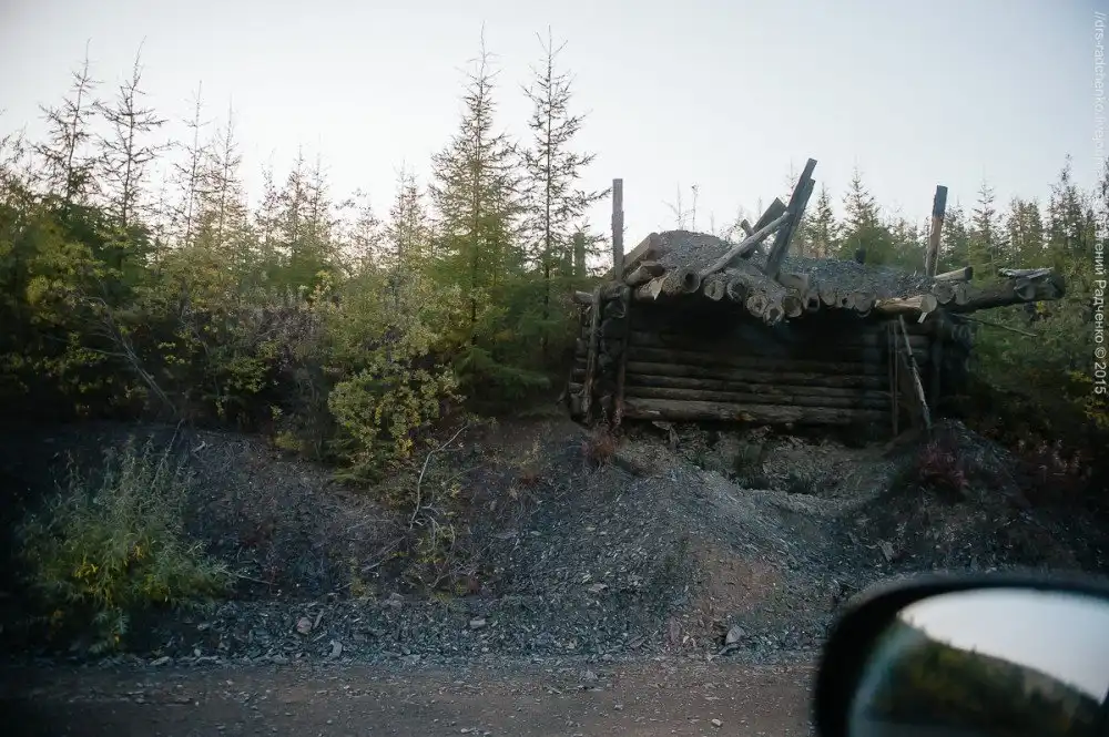 По дороге встречаются вот такие бункеры для грунта. Сверху грунт толкал бульдозер, насыпал в тачки или полуторки и отсыпали дорогу. Полусгнившие бункеры встречаются по всей трассе.