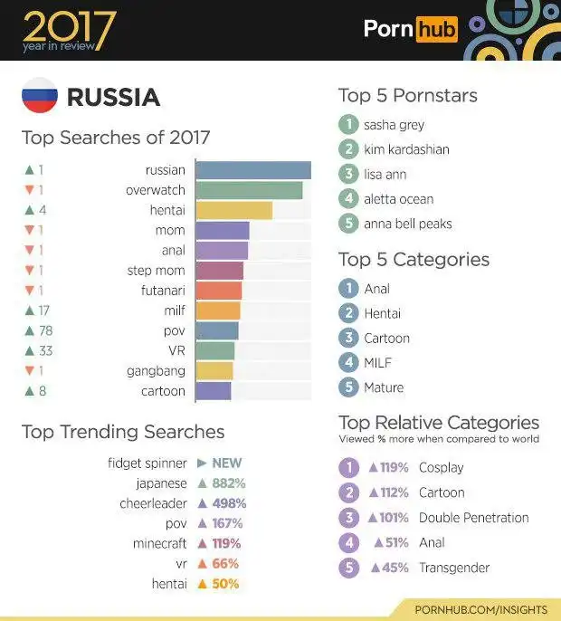 Среди российских пользователей сайта самыми популярными остаются видео с тегами «русские», Overwatch, «хентай», категория «мамочки» и анальный секс. Самой популярной у россиян порнозвездой остается Саша Грей, завершившая свою карьеру 5 лет назад.