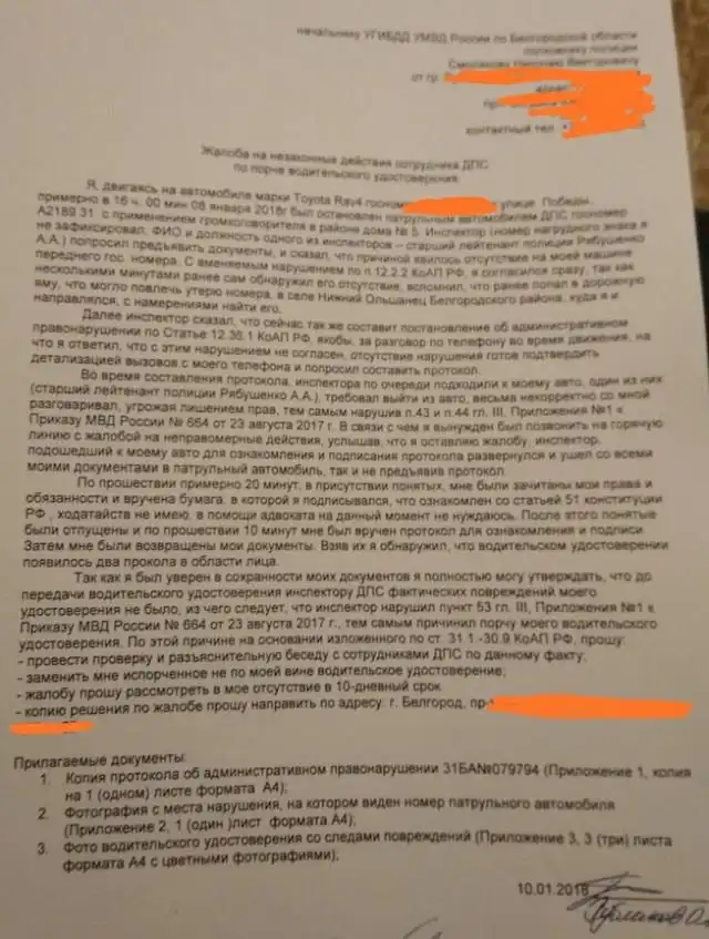 Белгородский автомобилист рассказал историю о том, как у него произошел конфликт с сотрудниками полиции. Это произошло 8 января, когда парень обнаружил потерю номерного знака и догадываясь о месте, где он может находиться, отправился за ним. По дороге его остановили инспекторы ДПС, назвав причиной остановки езду без номерного знака и разговор по телефону, что, по словам водителя, не соответствовало действительности. С самого начала разговор с полицейскими не задался и на автомобилиста стали составлять протокол, а сам он в это время позвонил в горячую линию ГИБДД. Один из инспекторов старший лейтенант полиции Рябушенко А. А. даже нашел понятых, вручив в их присутствии протокол на роспись. После этого молодому человеку отдали права, на которых он обнаружил метки, которых до этого не было. Затем сотрудники ДПС закрылись в машине и перестали отвечать на вопросы.