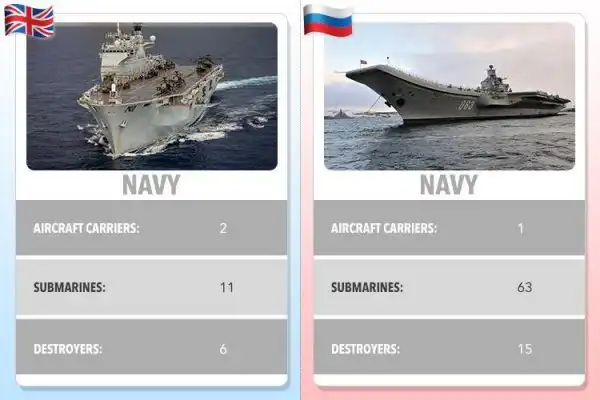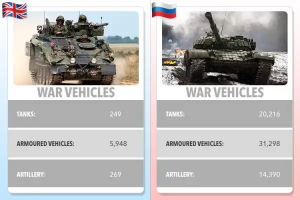Британцы опасаются военной агрессии со стороны России, глава британской армии предупредили, что Россия может начать войну на Западе "раньше, чем мы ожидаем". В преддверии этих событий на сайте thesun.co.uk решили сравнить статистические показатели армий России и Великобритании. По численности военнослужащих, самолетов, военных кораблей, танков и ядерных боеголовок британская армия уступает российской.