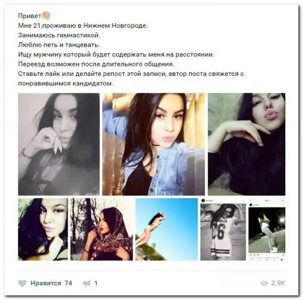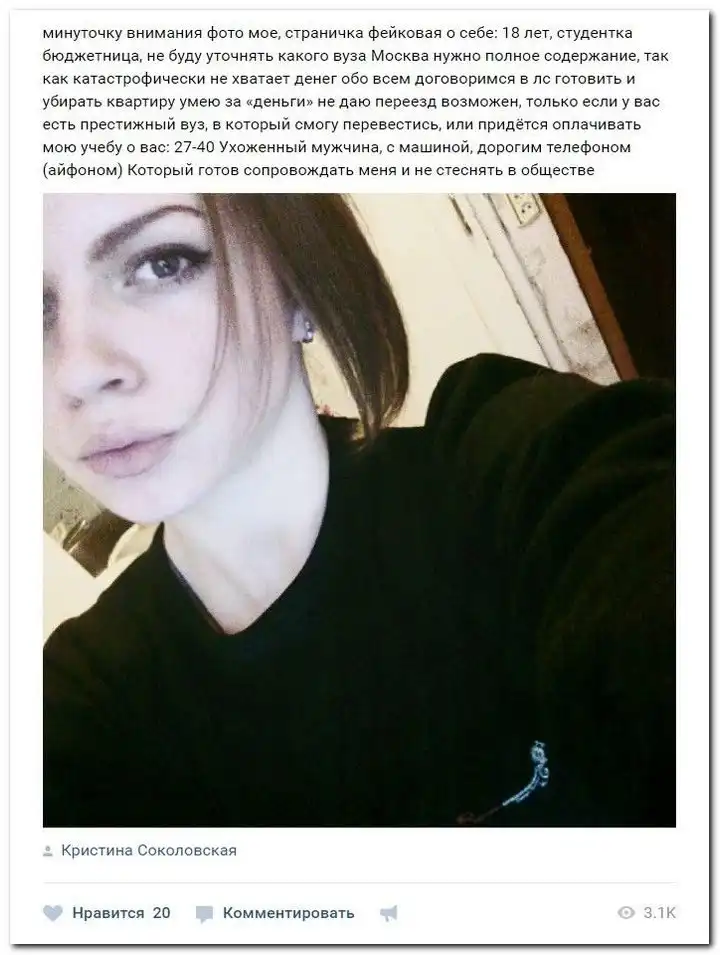 Эти наивные девушки хотят красиво жить и ничего не делать. Они надеются, что богатые спонсоры увидят их красоту, и в очередь выстроятся, предлагая свою помощь. Некоторые даже пишут, что никого интима, им должны заплатить чисто за приятное общение.