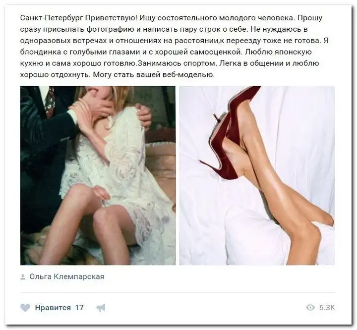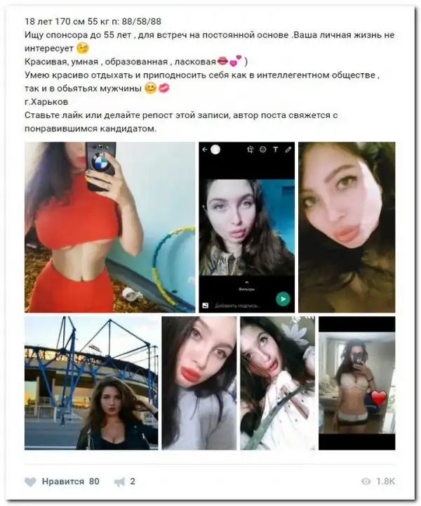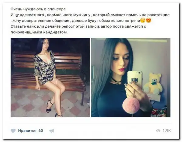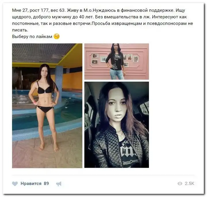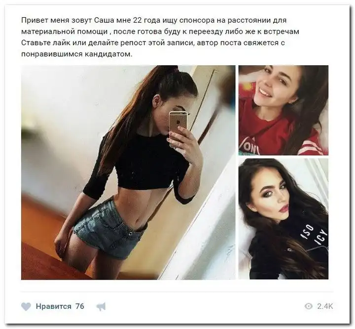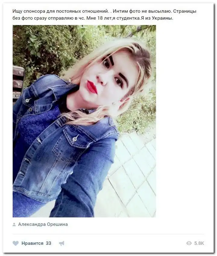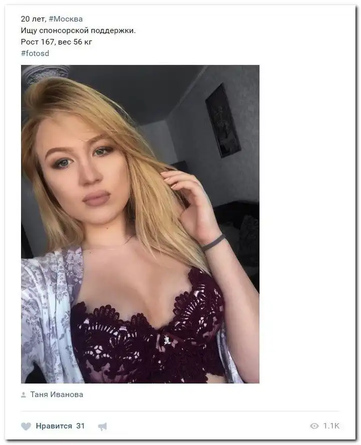Эти наивные девушки хотят красиво жить и ничего не делать. Они надеются, что богатые спонсоры увидят их красоту, и в очередь выстроятся, предлагая свою помощь. Некоторые даже пишут, что никого интима, им должны заплатить чисто за приятное общение.