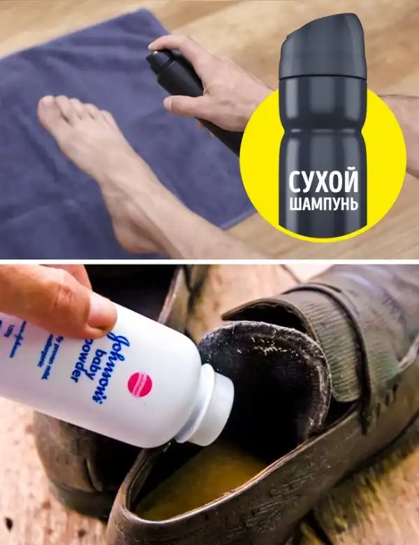Сухой шампунь можно нанести как непосредственно на ноги, чтобы сократить потоотделение, так и распылить внутри обуви, чтобы избавиться от уже существующего запаха. Устранить его также способна детская присыпка.