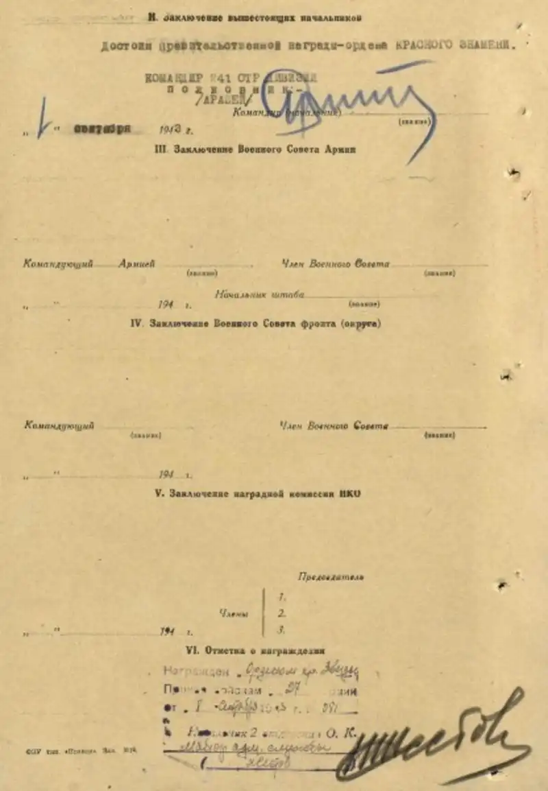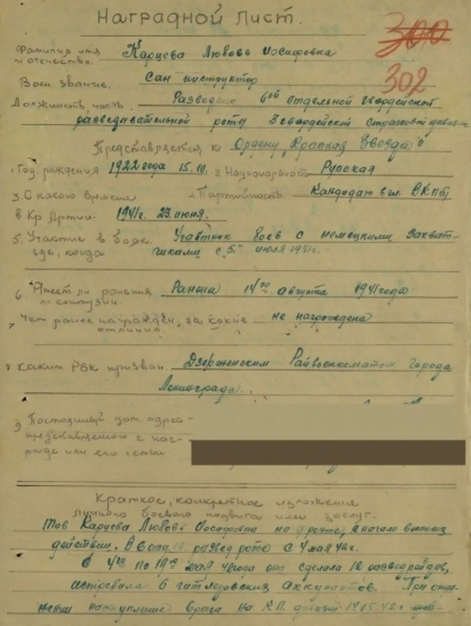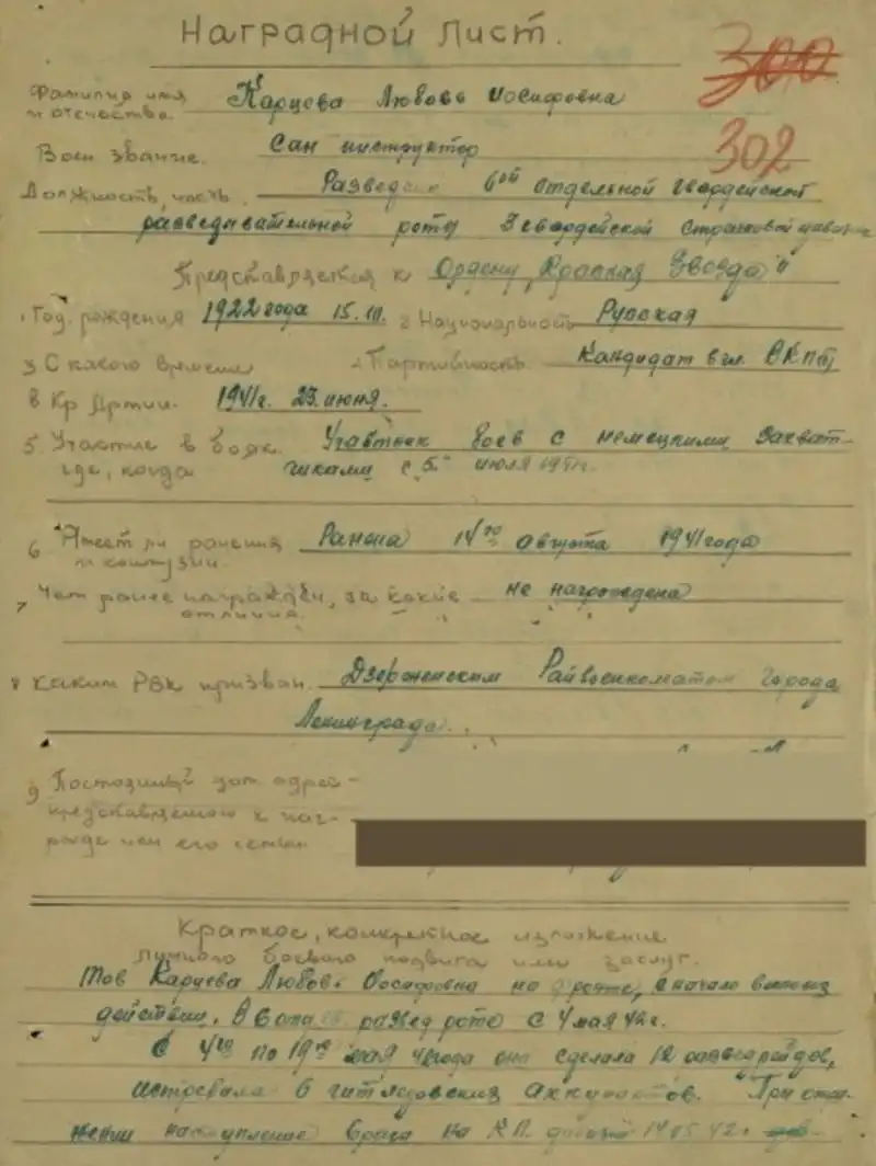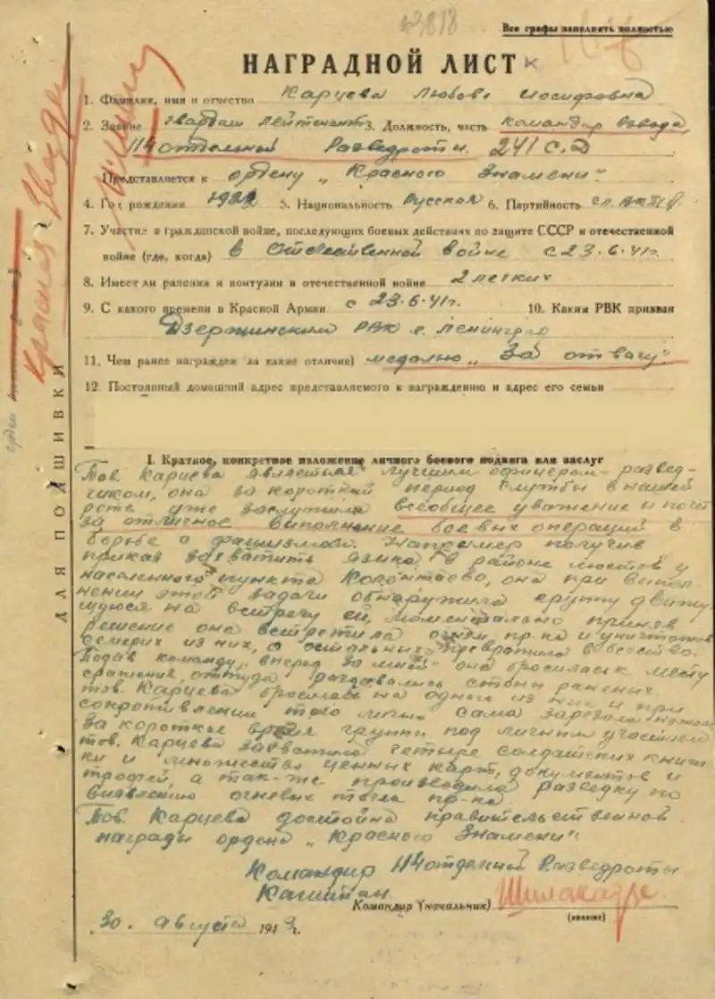 Наградной лист от 30 августа 1943 года на орден Красного Знамени. Награждена орденом Красной Звезды