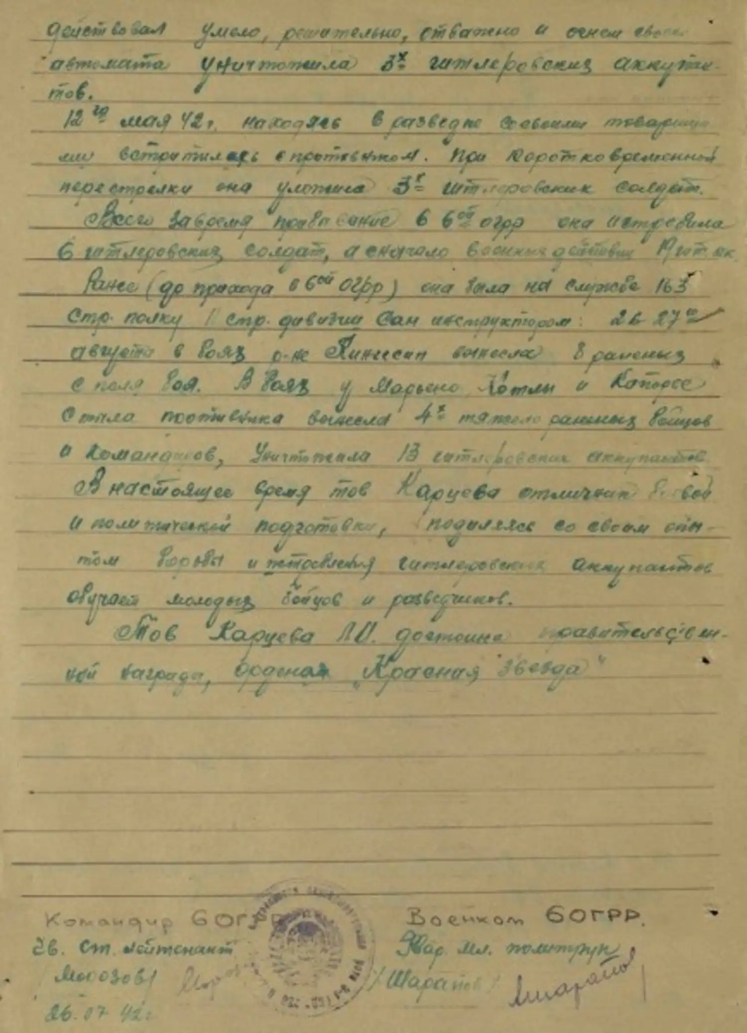 «Тов. Карцева Любовь Иосифовна на фронте с начала военных действий. В 6 отдельной развед. роте с 4 мая 42 г.