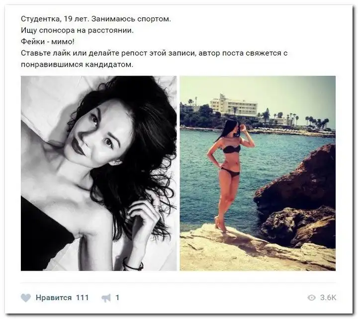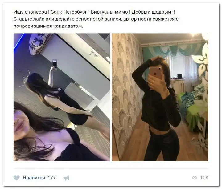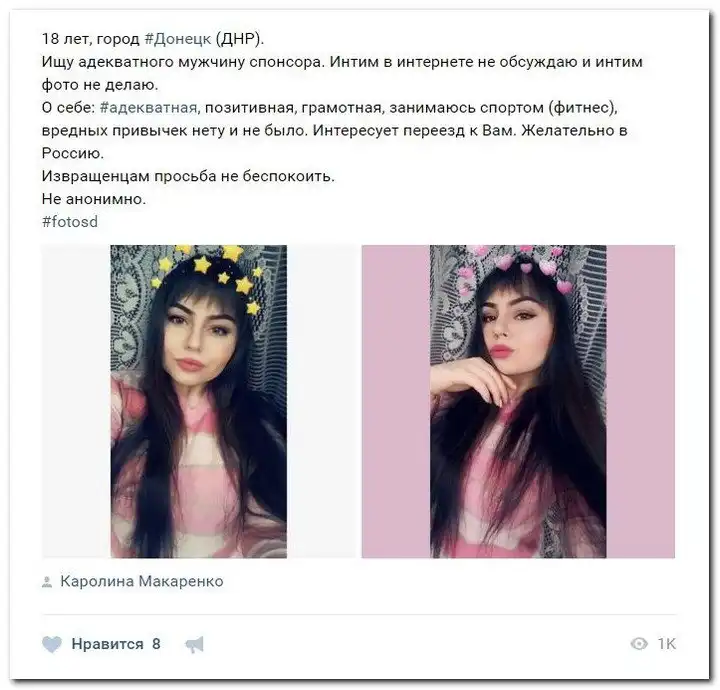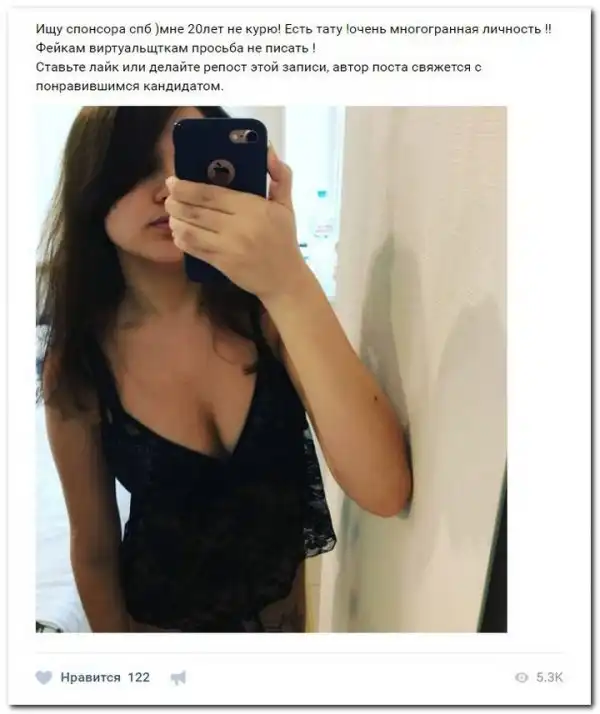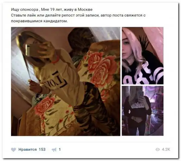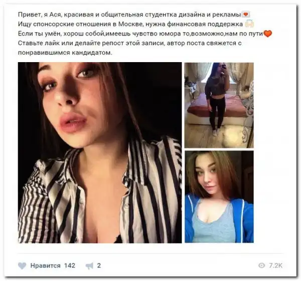 Эти наивные девушки хотят красиво жить и ничего не делать. Они надеются, что богатые спонсоры увидят их красоту, и в очередь выстроятся, предлагая свою помощь. Некоторые даже пишут, что никого интима, им должны заплатить чисто за приятное общение.
